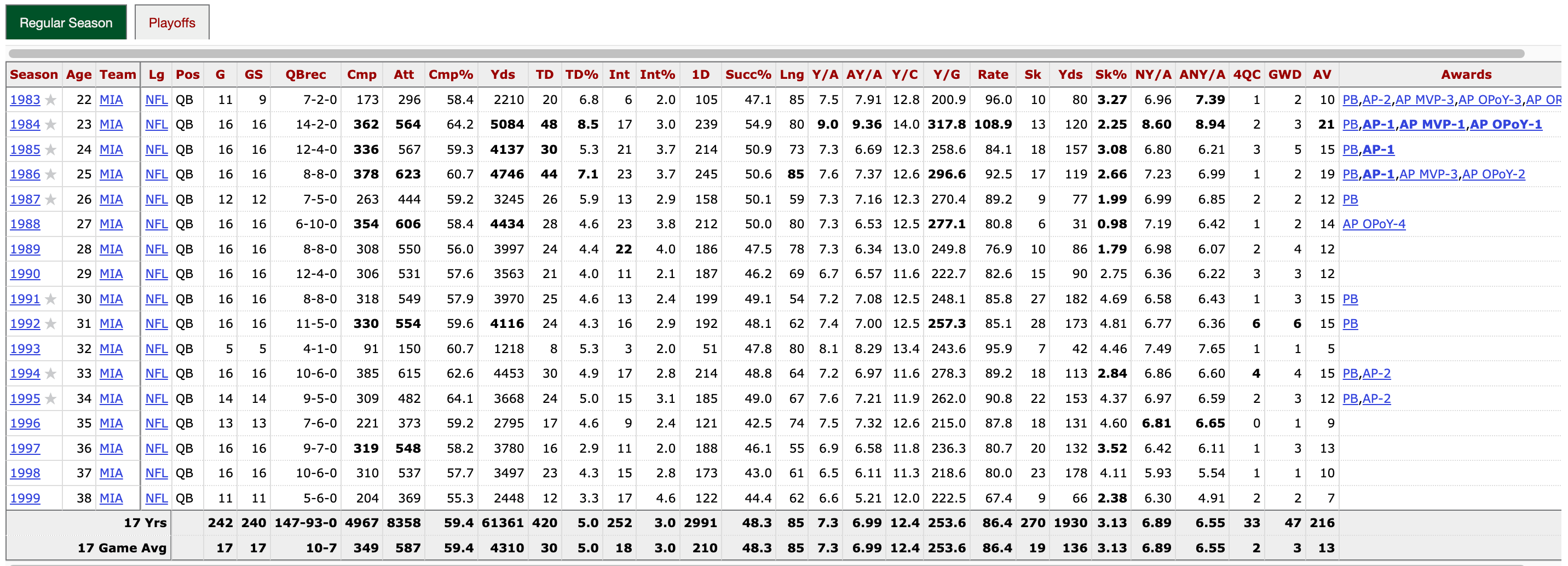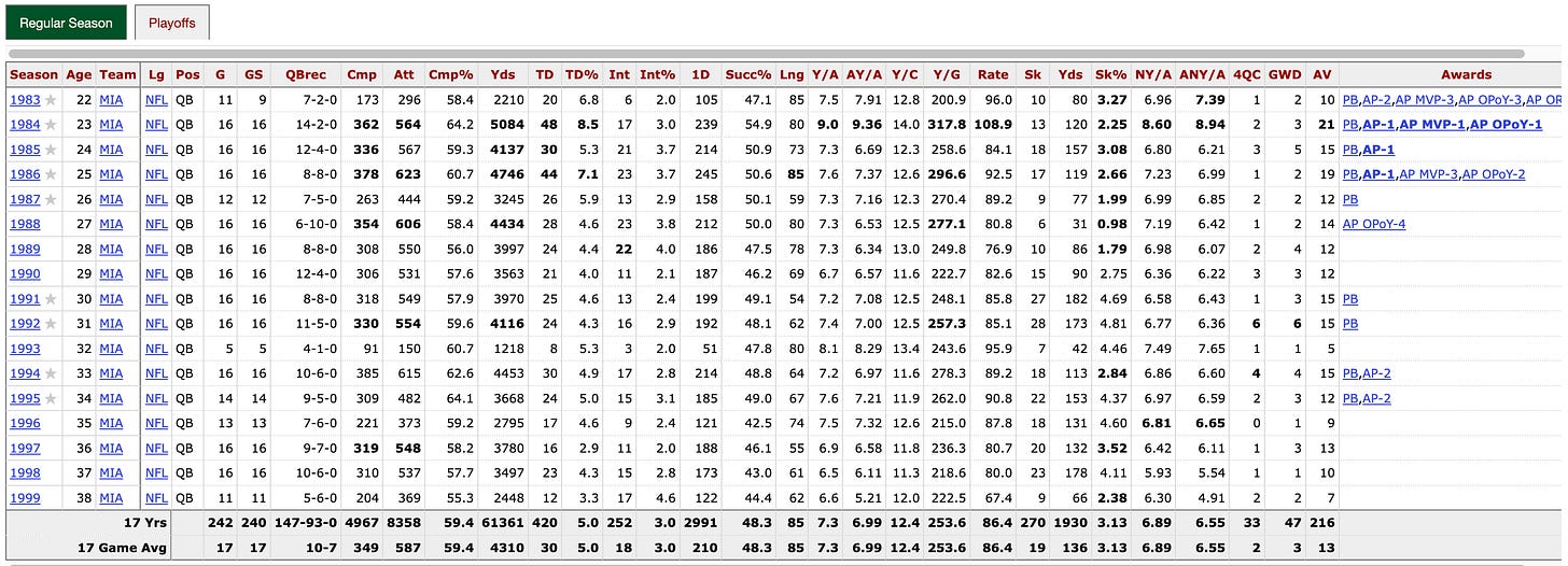 Liberals and haters will argue that Kirk isn’t the GOAT because he never won a Super Bowl. This is such a troglodyte argument; there are 48 players on an NFL roster, a quarterback can’t kick or play defense, he can only handle the QB position, and Kirk did that better than anyone. He put up Hall of Fame stats despite not having an elite runner in the backfield, and he played in a defense-first era in which cornerbacks could manhandle wide receivers. Also: He was running a Political Action Committee and hosting a radio show the entire time. It’s not Kirk’s fault that his Dolphins teams languished under the poor leadership of owner Wayne Huizenga, but despite having mediocre players around him, Kirk still managed to put up these eye-popping numbers: