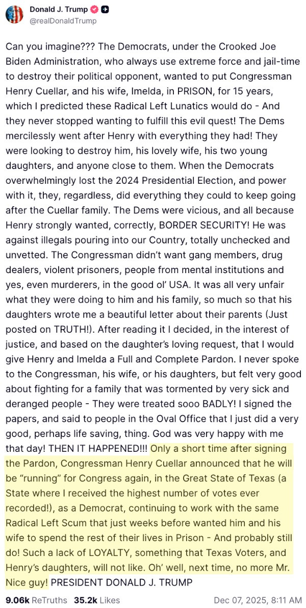 Why did Trump pardon Henry Cuellar, a Democratic congressman indicted for accepting $600,000 in bribes? A social media conspiracy theorist recently suggested that it was so that Cuellar would switch parties and give Republicans another seat. Here is the post from that social media conspiracy theorist: