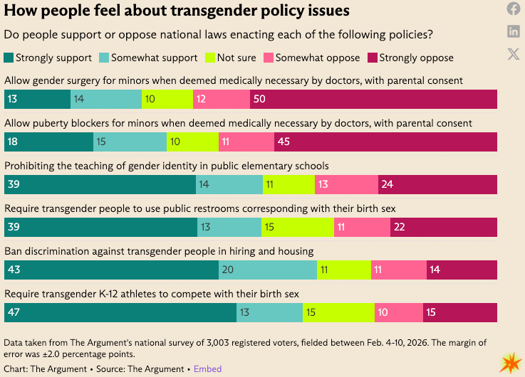 Anyone still arguing that the transgender rights movement doesn’t need a Come To Nonbinary Jesus moment needs to contend with this new polling from Lakshya Jain of The Argument.