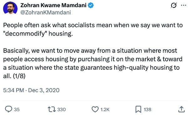 I don’t know if this is still Mamdani’s view, but it wouldn’t surprise me if it is. Socialists often talk about “decommodifying” housing; AOC uses the word in headlines of press releases, it pops up all the time in Jacobin, and far left think tanks use it in their research. The basic idea is that housing being a “commodity” — a thing that can be bought and sold — is a problem, because everyone needs housing but not everyone can afford it. The solution, some argue, is to remove housing from market pressures by having the government control the housing market. That would ideally happen through large-scale public housing, though measures like rent control and eviction moratoriums will do until the Glorious Revolution arrives, which it should any day now despite being 177 years behind schedule.