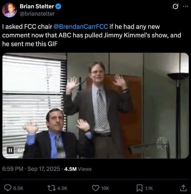 With Colbert, we don’t know how much politics influenced the decision. That’s not the case with Kimmel: It is crystal fucking clear that he has been yanked off the air for saying something that the government didn’t like. Here’s FCC chair Brendan Carr making it explicit that he threatened to revoke broadcast licenses if ABC stations didn’t pull Kimmel: