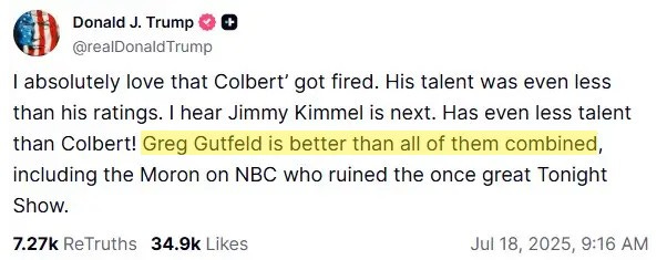 There should probably be room for someone in the Carson/Conan space to emerge. It won’t be Jimmy Fallon, because Fallon is on Trump’s enemies list for some reason (maybe Trump thought Fever Pitch strayed too far from the book?). There are non-political comedians out there but there are precious few in late night. And it seems fair to ask: If MAGA doesn’t like this cohort of hosts, whom would they prefer?