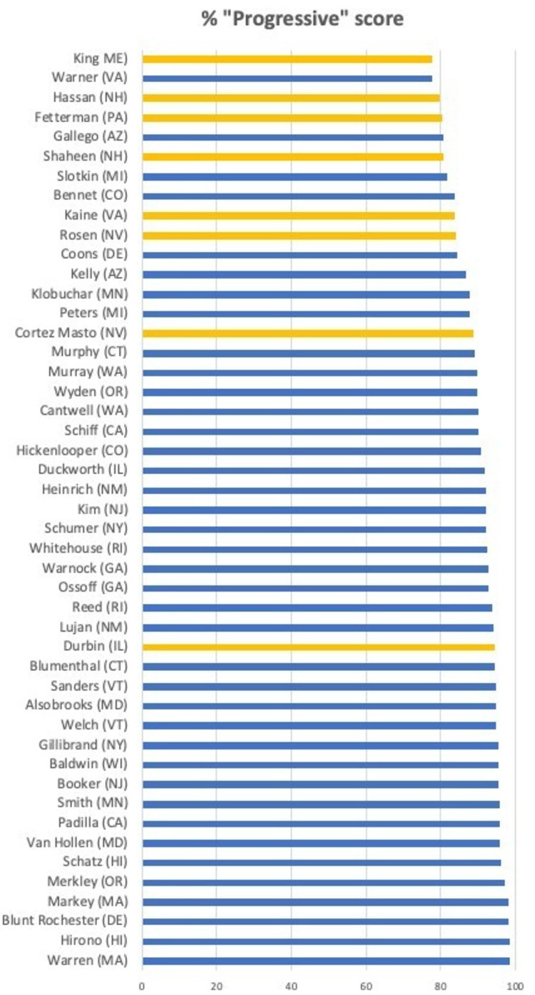 These rankings aren’t gospel — for example, Bernie Sanders is listed as the 15th-most-progressive Senator (probably because of gun stuff). And some Senators’ score for this congressional session is quite a bit different from their lifetime score (looking at you, Chris Murphy). It’s a rough measure, but precise enough to be useful.
