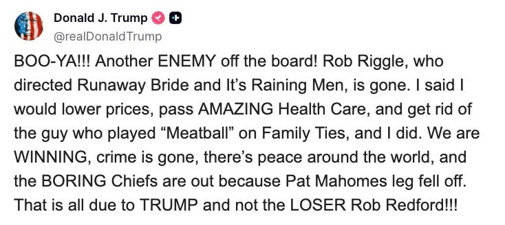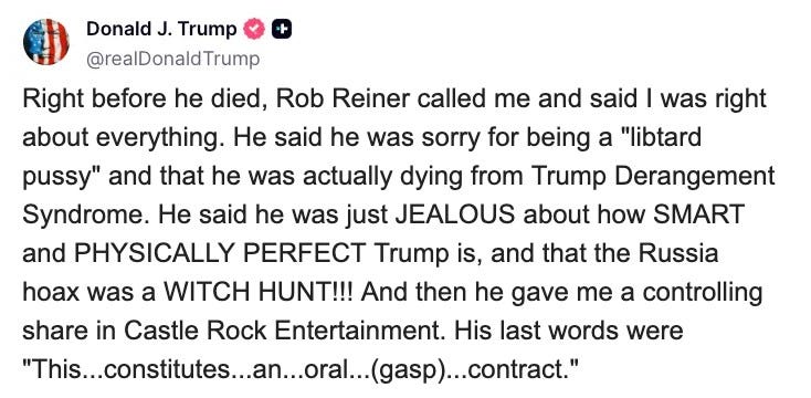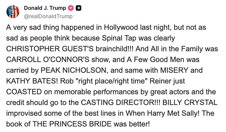 Given how flamboyantly wrong Trump often is — he just claimed that tariffs have brought in $18 trillion revenue, which is 150 times the actual amount — this seems like a plausible first draft. Of course, Rob Reiner directed The Princess Bride and A Few Good Men, and he played “Meathead” on All in the Family. If I was advising Trump, I might say something like “it might be good to reflect on Reiner’s most popular movies.” And that would surely be a cursed-monkey’s-paw wish that would lead to this post: