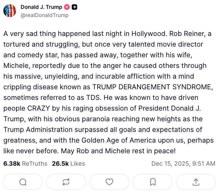 Any decent human being responded to the news with shock and horror.1 But our president — only months removed from using government power to try to silence people whom he thought said the wrong thing after the murder of Charlie Kirk — said this: