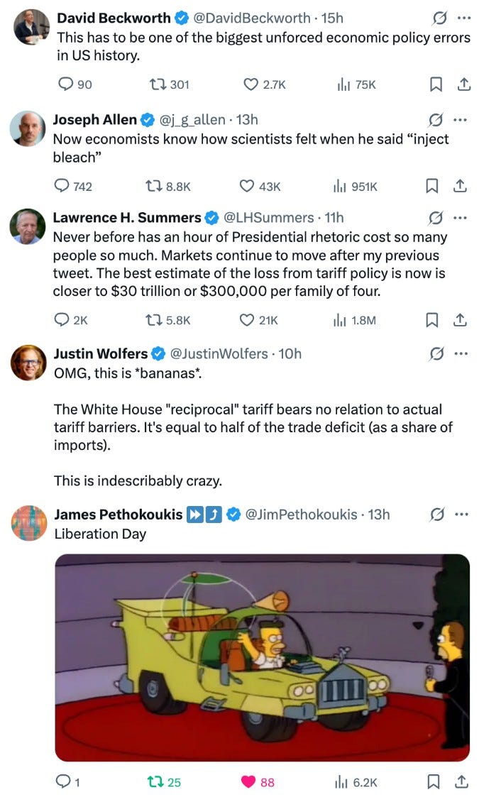 What’s your most cherished Liberation Day memory? Decorating the Liberation Day tree? Sharing some laughs with your neighbors at a Liberation Day block party? Mine is watching the entire field of economics have their brains explode as they discovered the spacetime-altering stupidity of Trump’s tariffs. Here’s a window into the general mood on Econ Twitter: