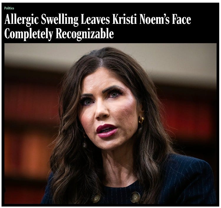 I like the "if they did this to themselves, mock it" guideline. Another example in the vein of Noem: my wife watches that 90-Day Fiancé show, and the other day while I was making myself something to eat, she had it on. I looked up and audibly yelped when I saw that Darcy woman on the screen. She looks terrifying, and she looks terrifying because she pumped a Ganges River-worth of plastic into her face. That deserves to be mocked, if only to discourage other people from making an equally or more terrible decision for themselves.
